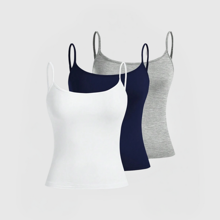 This cami top trio is designed for effortless layering, lounging, and living. With a soft, breathable feel and flattering stretch fit, you’ll always have the right color ready — white, navy, and heather grey.